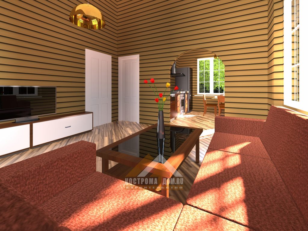 Проект одноэтажного дома из бруса общей площадью 42,8 м2, в котором расставлена вся мебель с учетом комфортного проживания в доме. Проект компактно содержит две спальные комнаты, кухню-гостиную, санузел, холл и тамбур. А также имеется небольшое крыльцо.