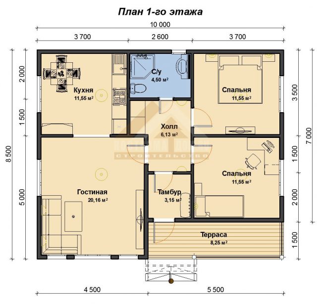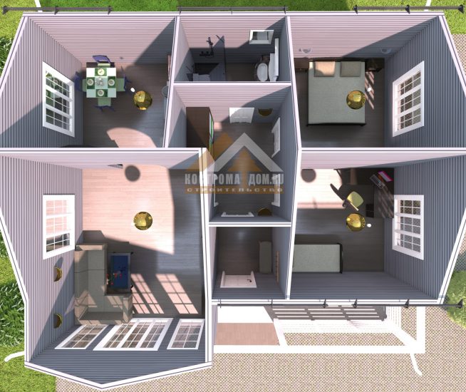 Проект одноэтажного дома из бруса общей площадью 76,8 м2, в котором расставлена вся мебель с учетом комфортного проживания в доме. Проект компактно содержит две спальные комнаты, кухню-гостиную, санузел, холл и тамбур. А также имеется небольшое крыльцо.